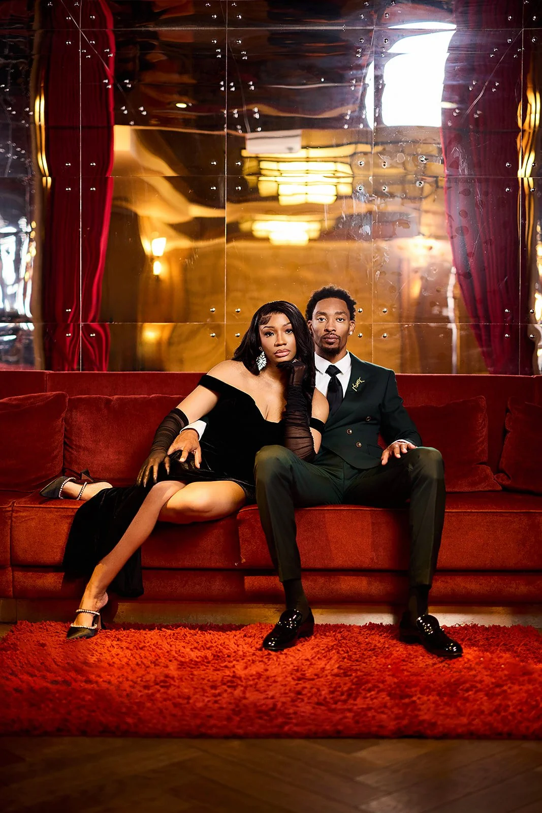 Qianna and Deshaune’s Regal Romance-themed engagement session at the luxurious Riggs Hotel was a testament to their love story, beautifully capturing their love and commitment.